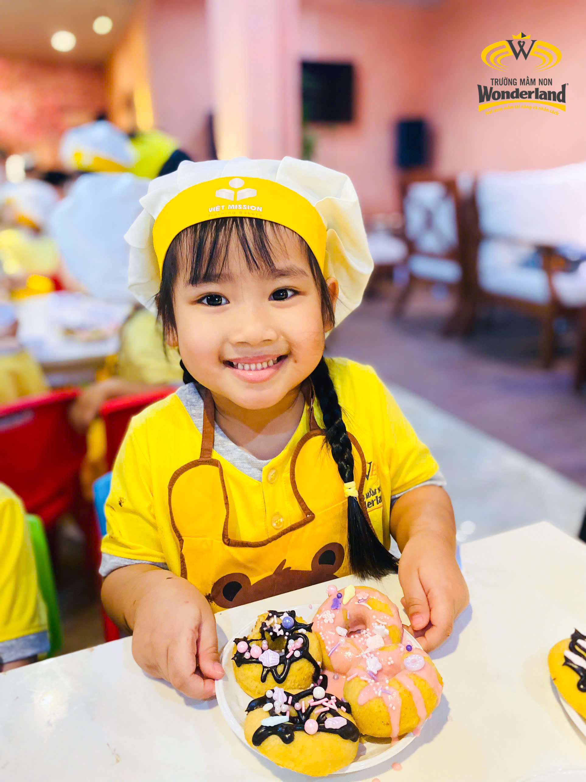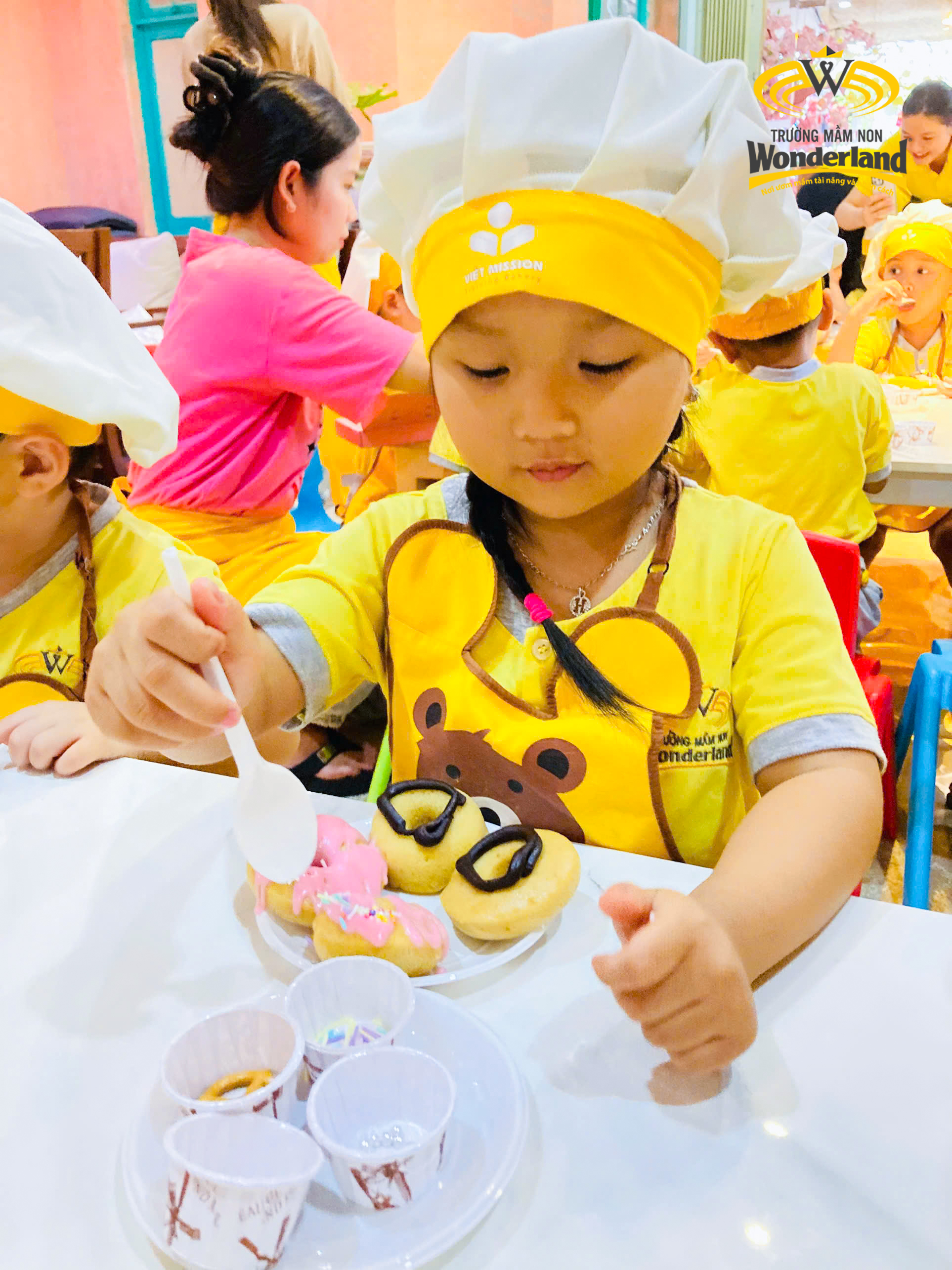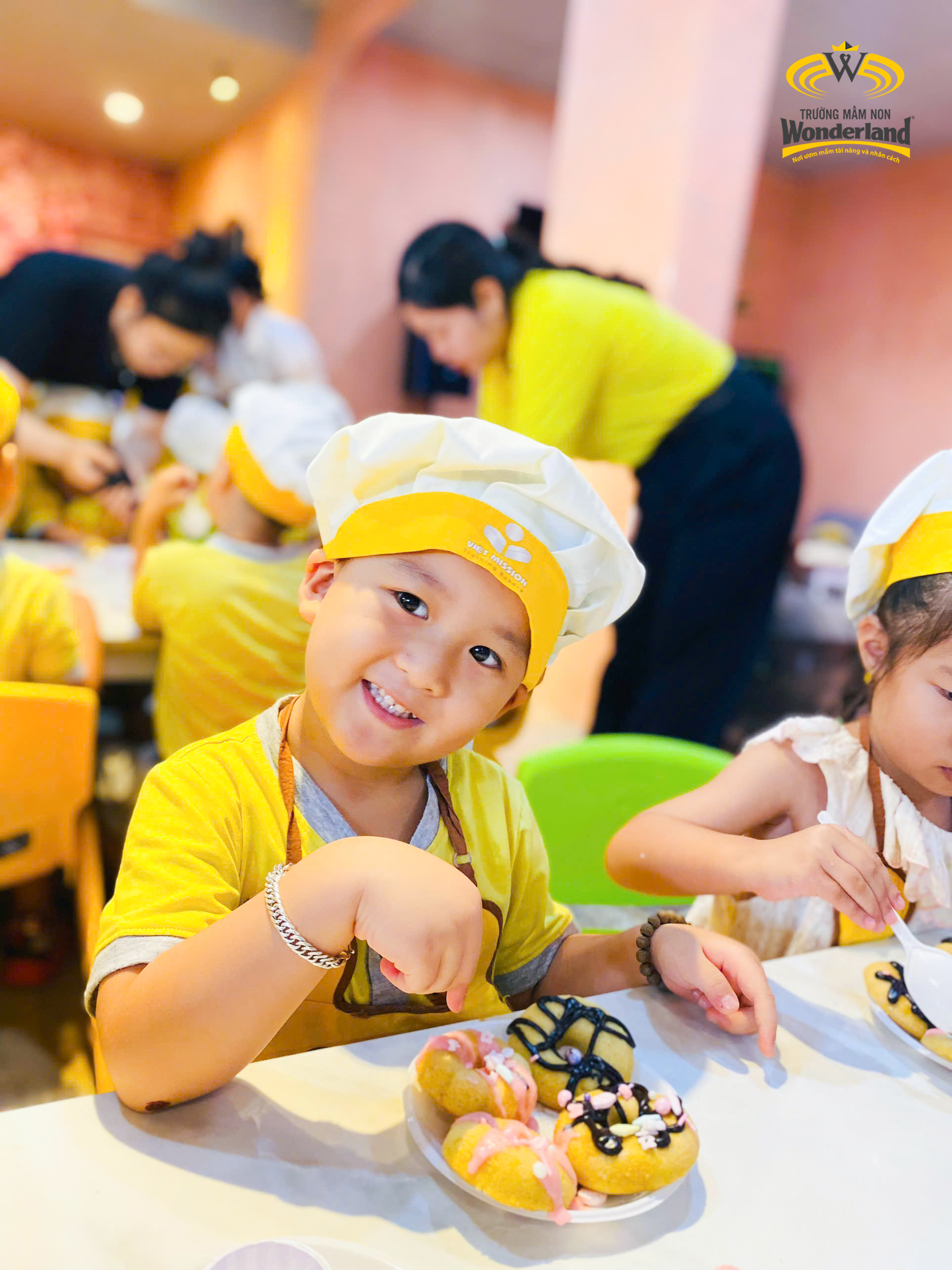 Khép lại chuỗi dã ngoại là chuyến đi làm "Đầu bếp donut nhí” của Wonderkids khối Mẫu giáo 3-4 tuổi. Tại đây, các bé tự tay trải nghiệm quy trình làm ra những chiếc bánh donut hấp dẫn dưới sự hướng dẫn nhiệt tình của các cô và đầu bếp. Các Wonderkids trông vô cùng hứng khởi khi tự nhào bột, trang trí bằng đủ loại topping sặc sỡ…và được thưởng thức ngay tại buổi wordshop.