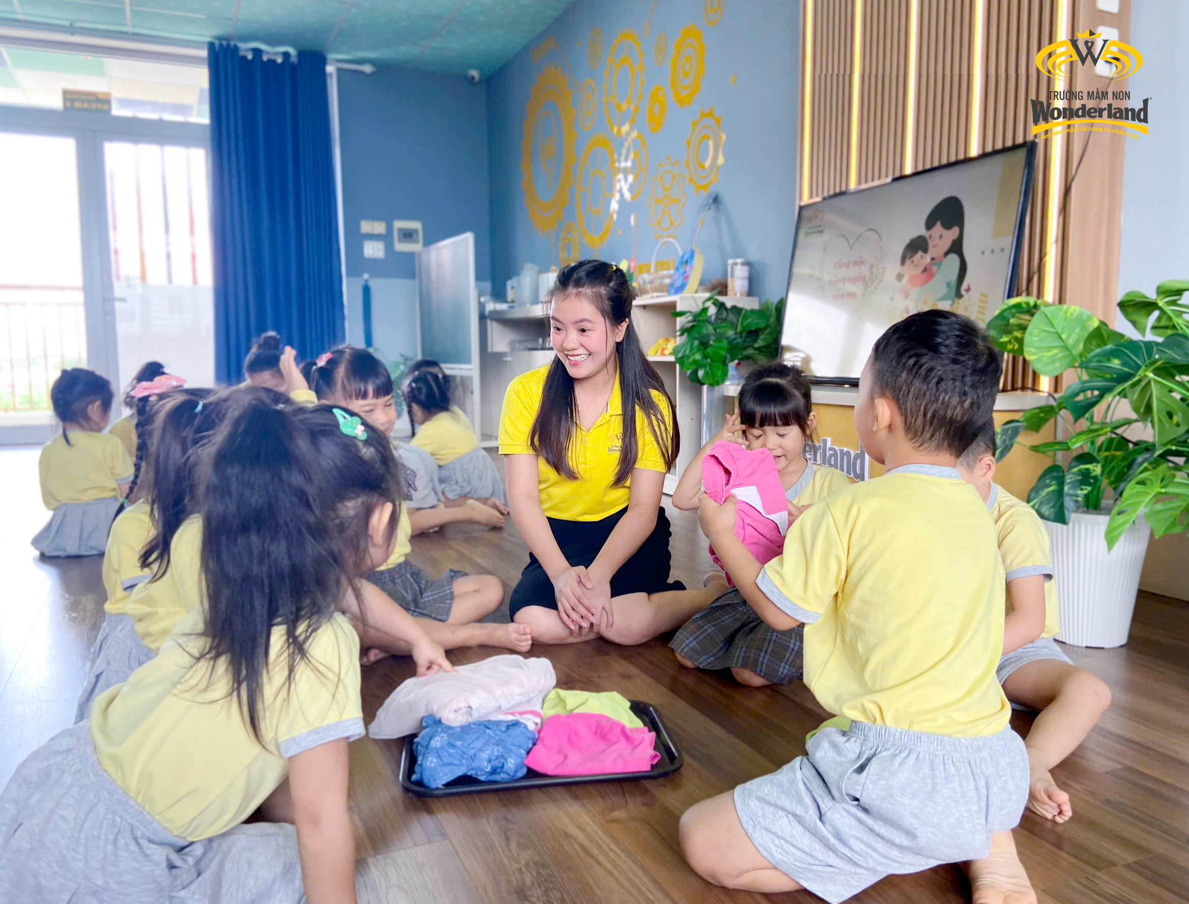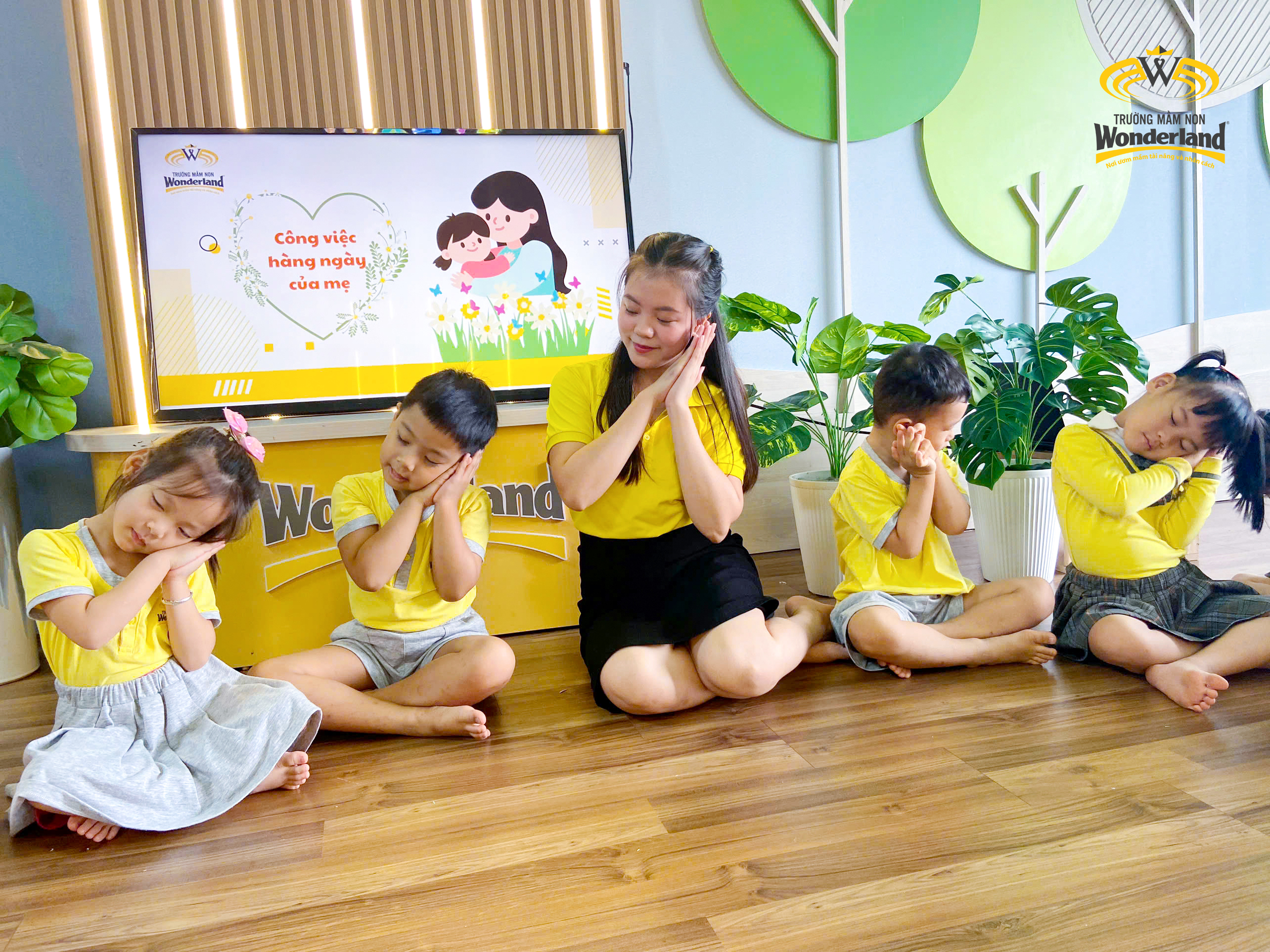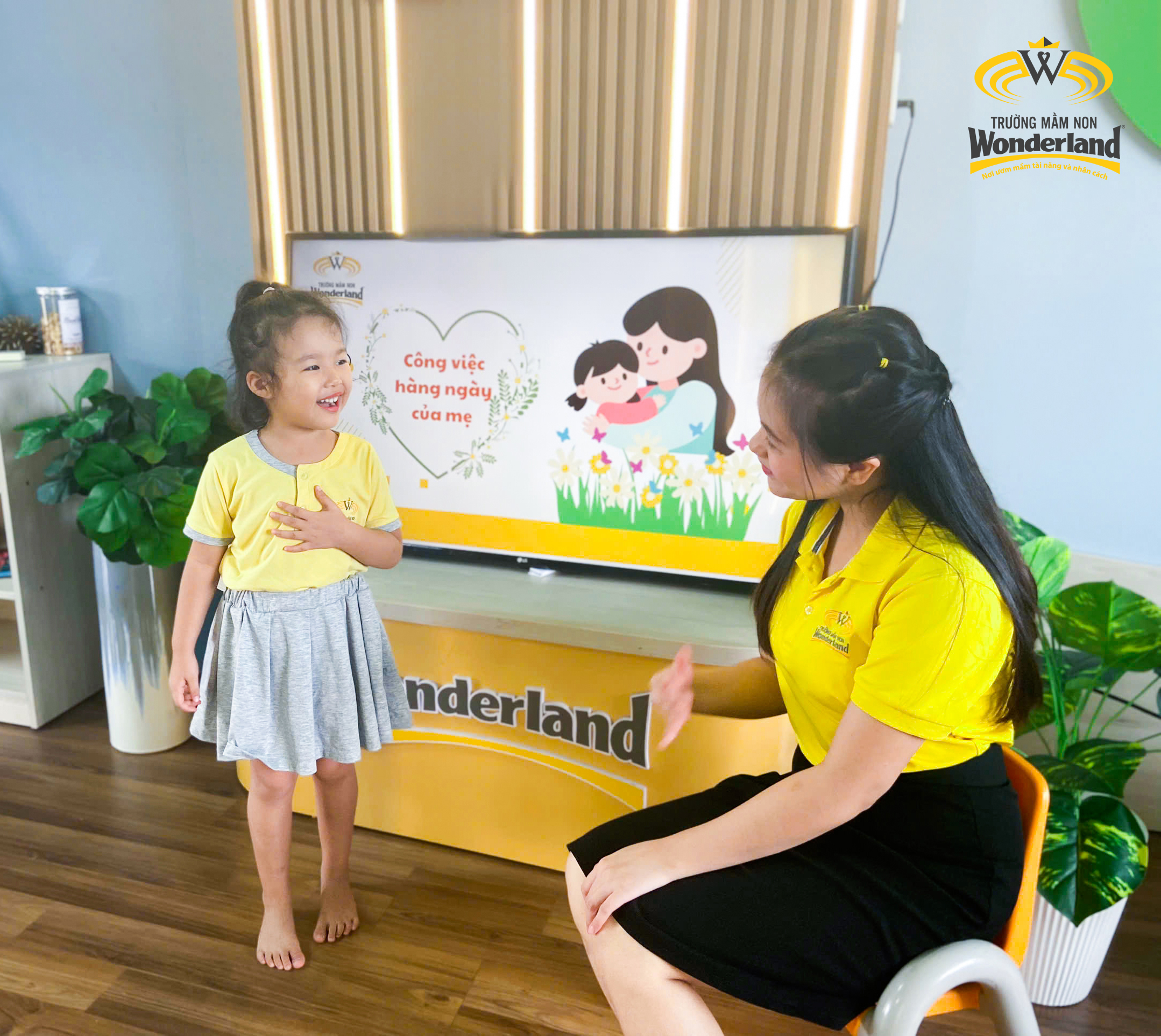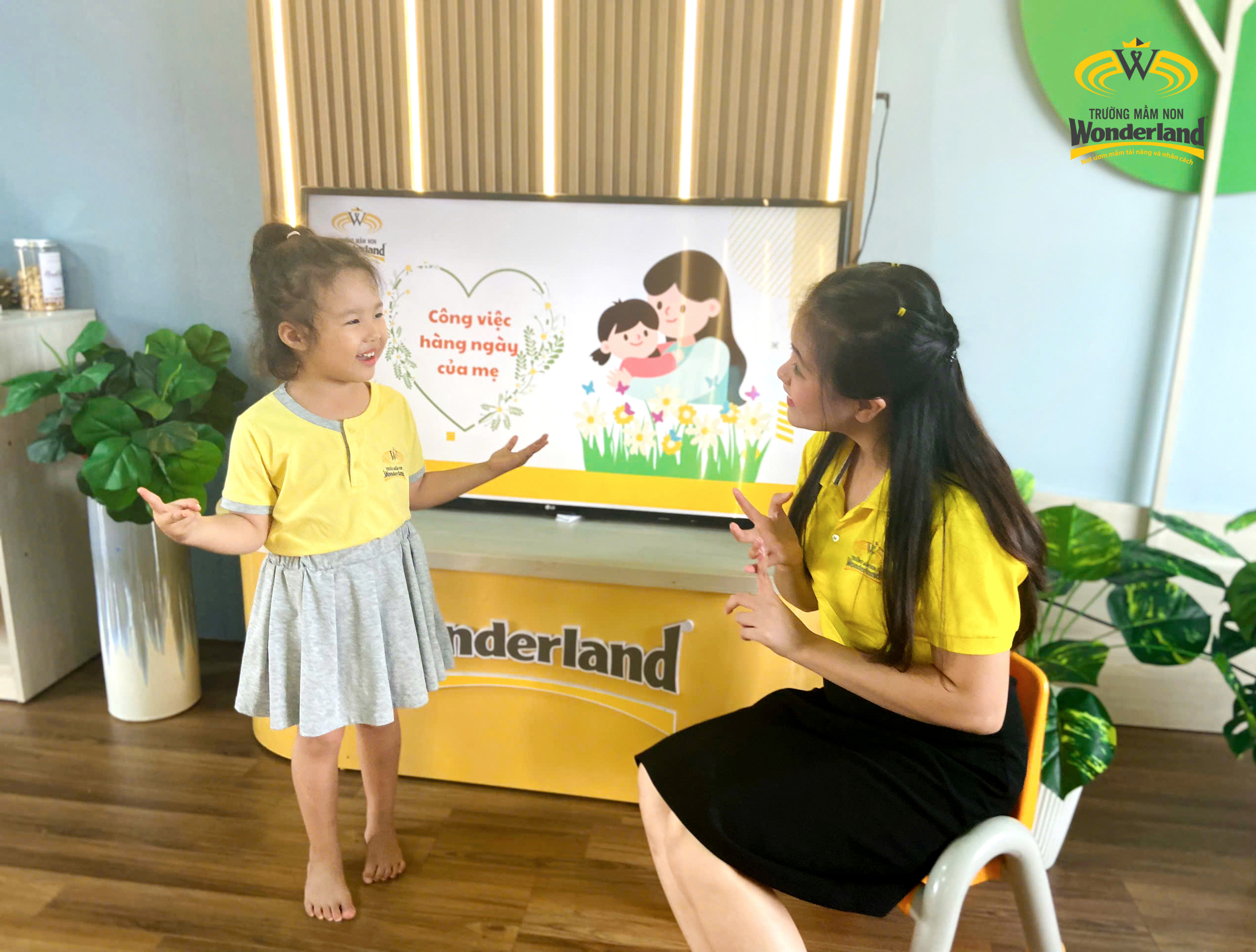 Giờ hoạt động khám phá của khối 4 -5 tuổi, dưới sự dẫn dắt của cô giáo, các Wonderkids được tự mình chia sẻ những thông tin, cảm nhận về công việc của mẹ như: “Hàng ngày, em thấy mẹ đã làm những công việc gì? các công việc đấy có ý nghĩa như thế nào? giúp ích gì cho em, cho gia đình? em có sẵn sàng giúp mẹ công việc hàng ngày không? em sẽ giúp mẹ bằng cách nào? em có muốn nhắn nhủ gì tới mẹ không?...”